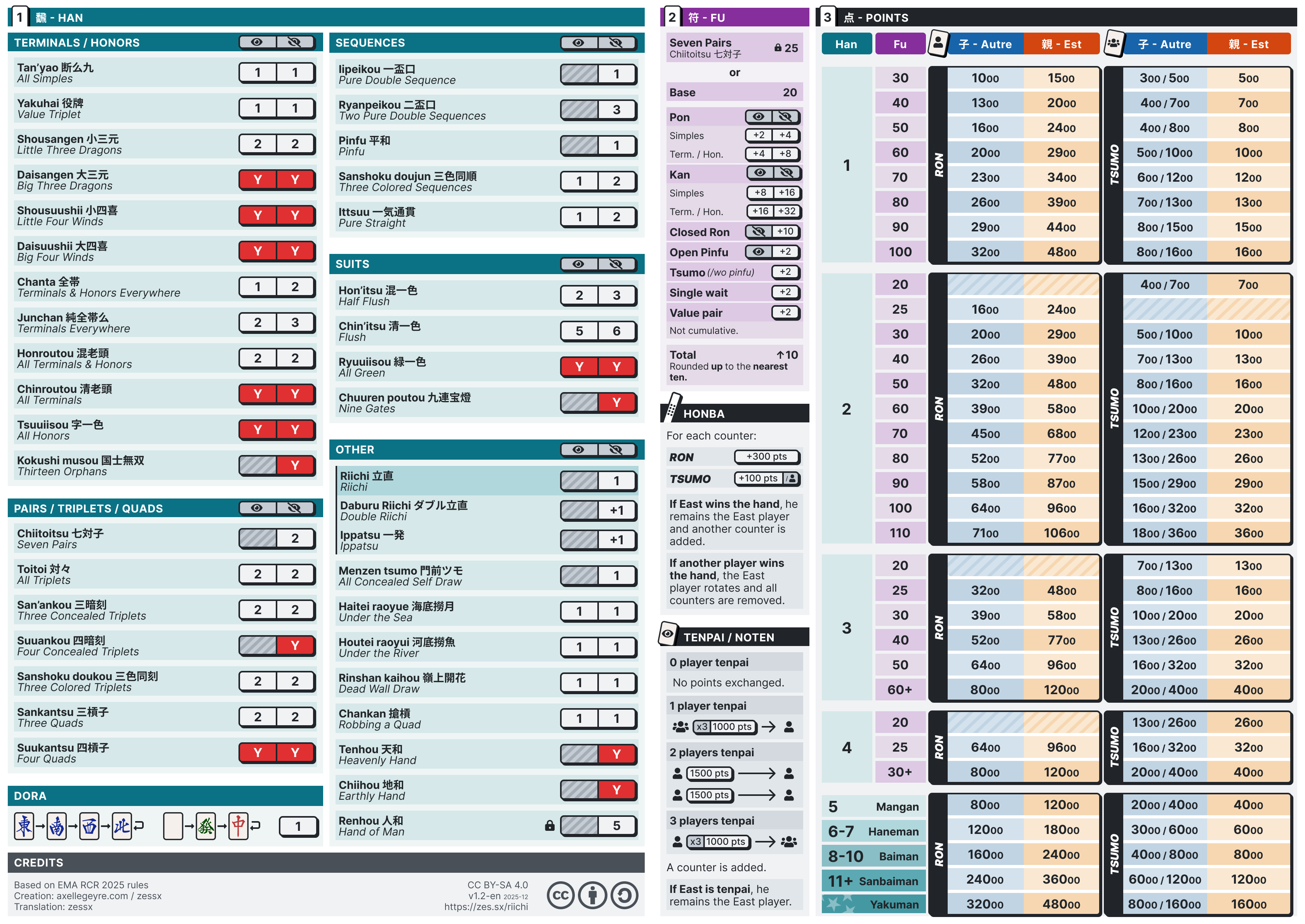Les Riichi Competition Rules (RCR) sont implémentés en compétition depuis 2008 et sont révisés fin 2025. Ci-dessous vous pouvez télécharger des aperçus utiles : le premier pour les initiations/débutants, le deuxième avec les yaku, et le troisième avec le tableau de calcul des scores.