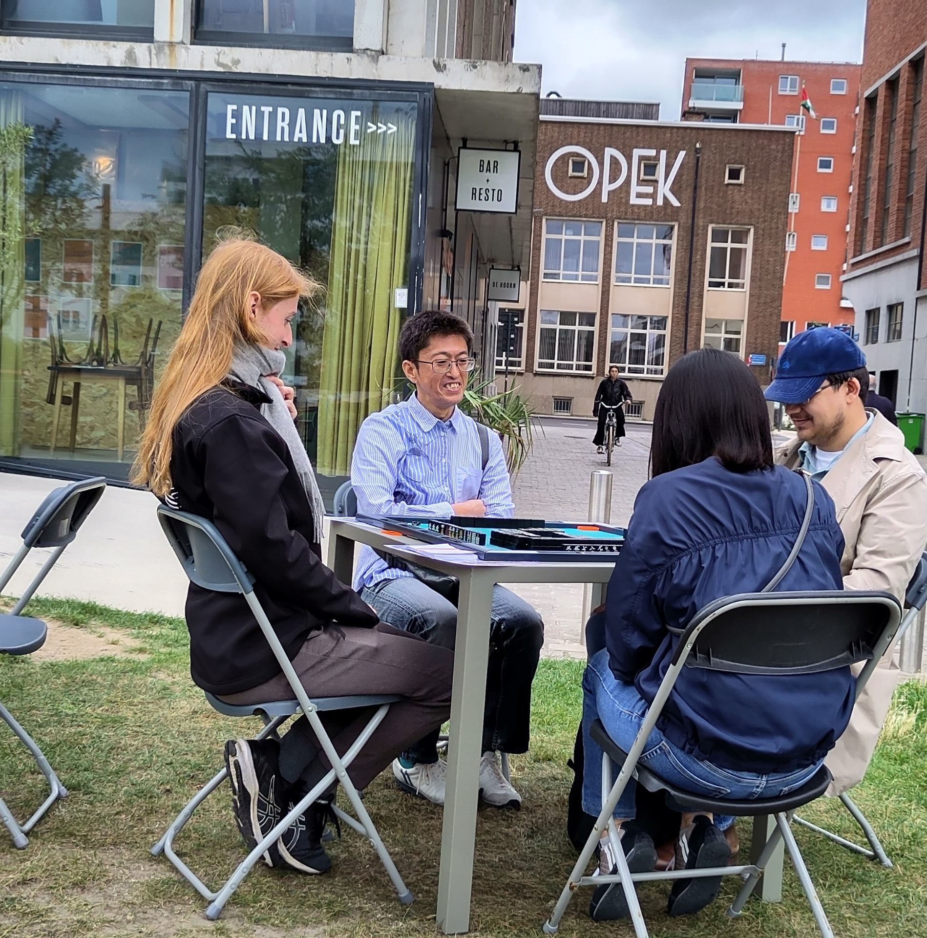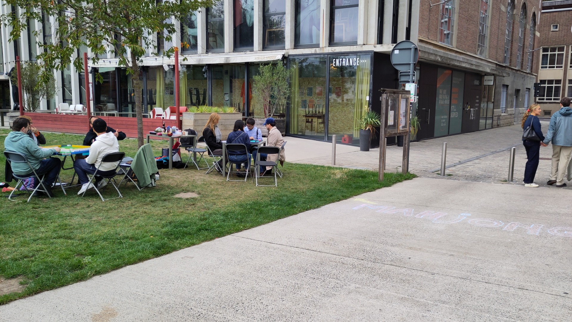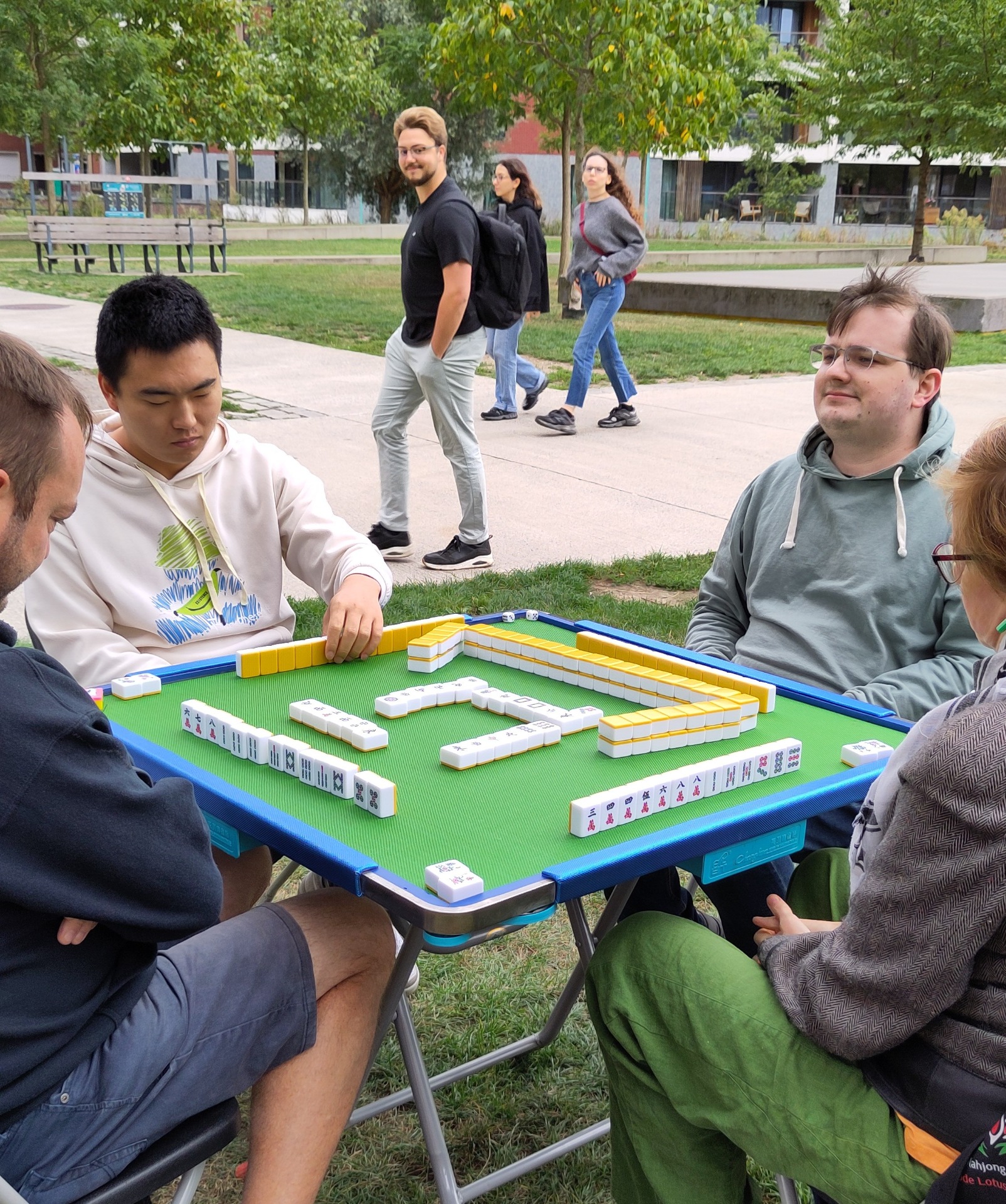 Weinig zon en een fris windje op deze autoloze zondag, maar wel genoeg dappere Lotussen (en een verdwaalde CMC-er) om samen buiten te genieten van een spelletje mahjong en al dan niet toevallige voorbijgangers kennis te laten maken met het spel. Voor de gelegenheid werden de zwarte riichi set en de mooiste en grootste Chinese set uit Geerts collectie boven gehaald. We zaten helaas ver van alle andere activiteiten en er was dan ook minder passage dan bij de vorige editie, maar toch werden we goed opgemerkt en namen heel wat verschillende mensen plaats aan de tafel. Een klein beetje motregen moesten we wel trotseren, maar gelukkig kunnen de stenen daar tegen!