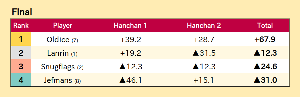 Het Belgian Riichi Mahjong Glorified Online Friendlies toernooi werd vanavond afgesloten met de vier finalisten gedurende twee bloedstollende hanchan op MahjongSoul. Nathan G (BMC) begon als Oostspeler en won de eerste hanchan met een stevige voorsprong op Lander (Antwerpen), die in de voorrondes mijlenver voorop liep. In de halve finale versloeg hij Joris (DaisanGhent), Ako (Rode Lotus) en Isabelle (BMC). Nathan won zijn halve finale van Alice (Pigeon), Jeffrey (DaisanGhent) en Gregory (Rode Lotus). Gentenaars Jeffrey en vooral Joris delfden tijdens de finale het onderspit. Met o.a. wat lucky dora kon Nathan zijn positie stevig verankeren in de tweede hanchan, hoewel Joris het grootste deel van de ronde eerst stond. Lander werd laatste in de finale ronde, maar behield zijn podiumplaats. Aangezien zijn kokushi poging ii-shanten vastliep, moest Jeffrey tevreden zijn met de derde plaats, en Joris greep helaas helemaal naast de prijzen. Opmerkelijk, Jeffrey scoorde twee maal exact dezelfde score in de twee finale hanchans, die nog gelijk was aan het eindtotaal van Lander.