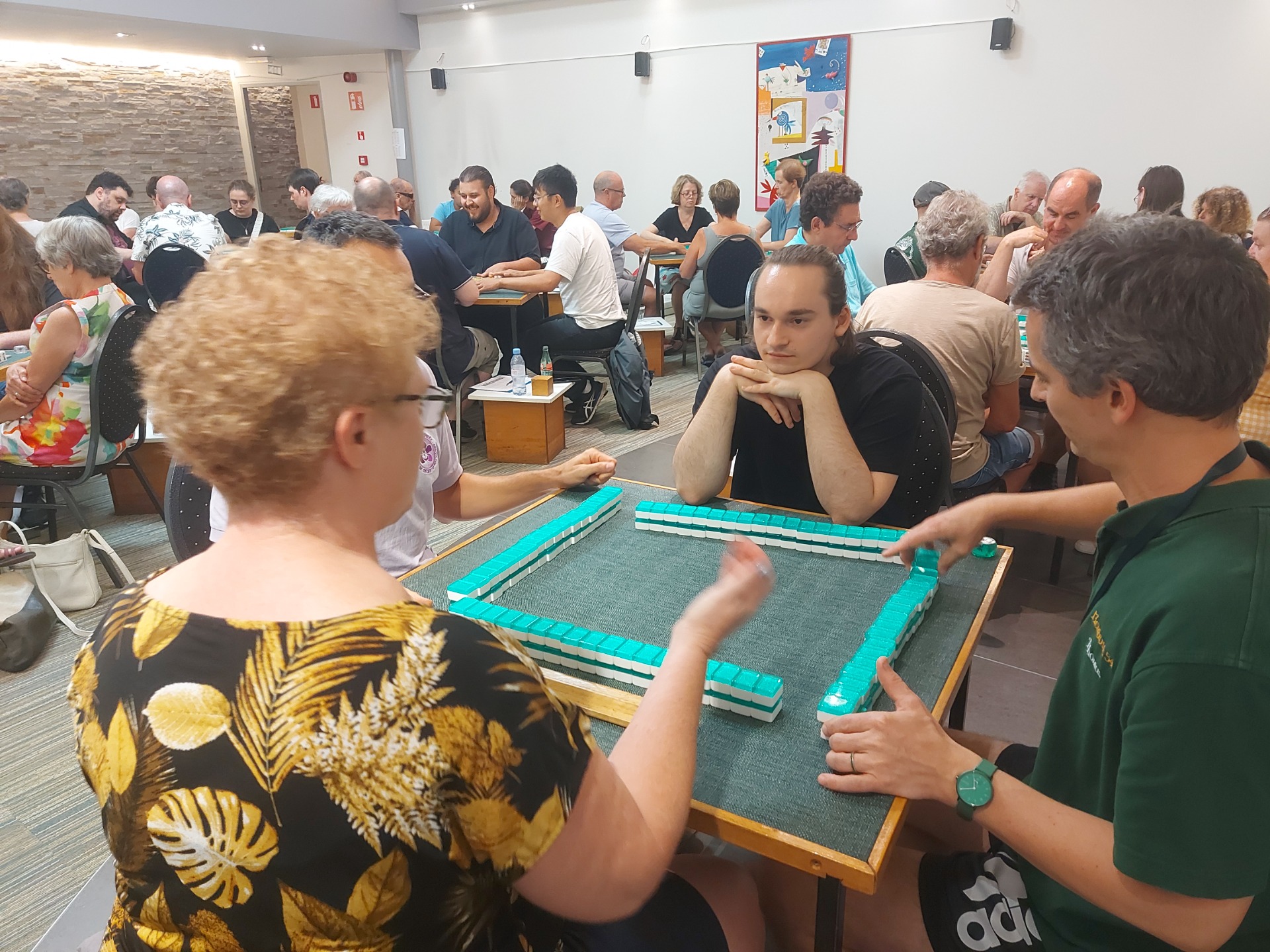 Vrijdagavond gingen we van start met social play en pre-registratie in de bridgeclub Pieterman. We vulden drie tafels met MCR en een tafel met Riichi. Het was broeierig warm in de grote zaal tijdens deze nooit eerder geziene hittegolf in september. Maar tot de verbazing van velen heerlijk koel zaterdagochtend. De airco was ontdekt! Enkele Franse spelers waren er al enorm vroeg bij, zelfs te vroeg voor koffie, en hielpen met het uitpakken van de spellen die door Michel werden aangeleverd vanuit Temse. Alle deelnemers kregen een genummerd ministeentje met bijhorend loopbriefje. Lotus Lies was eerste reserve en zat al klaar bij de voorziene start om 9u15, maar de Gentse Hui haalde het nog net op de valreep. Hij mocht beginnen met 10 strafpunten.