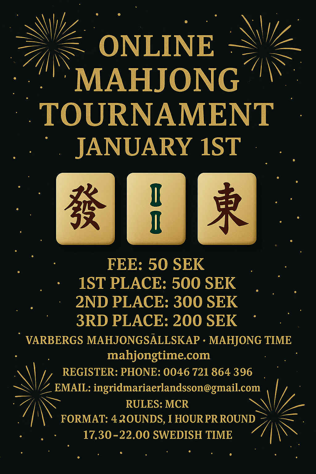 Hou je wel van dit soort competitie, en speel je al op Mahjong Time? Dan is ook het Nieuwjaarstoernooi op 1 januari misschien iets voor jou? Het kost je 50 SEK (te betalen via PayPal) en je speelt vier rondes van 17u30 tot 22u. De prijzenpot bestaat uit 1000 SEK (500/300/200). Contacteer om in te schrijven ook Ingrid-Maria via de gegevens hierboven.